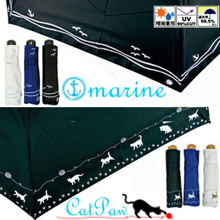 YBB195【 雨傘兼用マリン/キャッツポウ 折りたたみ傘UVカット率99%、遮光率99.5%日傘】ネコカモメ船梶イカリかもめ晴雨兼用傘紫外線対策catねこネコ黒白猫シルバーコーティング晴雨兼用折り畳み傘UV99%カット50cm楽々ミニUV対策ひんやり傘折畳傘折りたたみ傘.